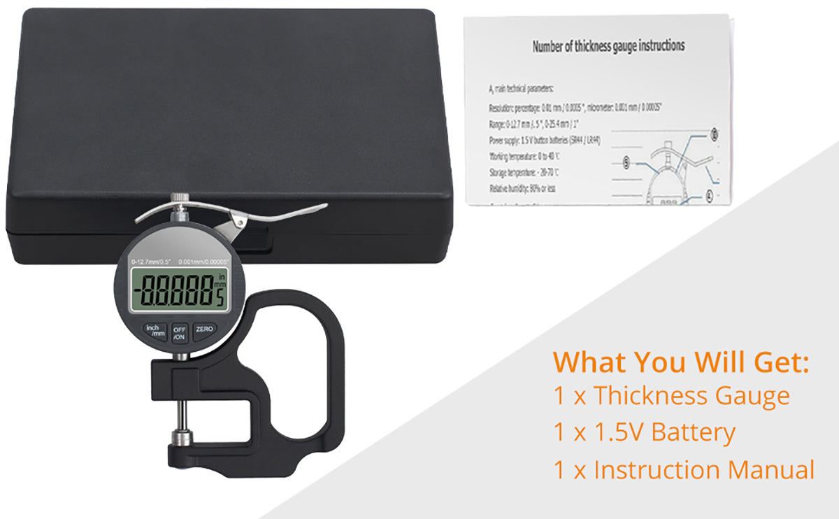 1 x Thickness Gauge 1 x 1.5V Battery 1 x Instruction Manual